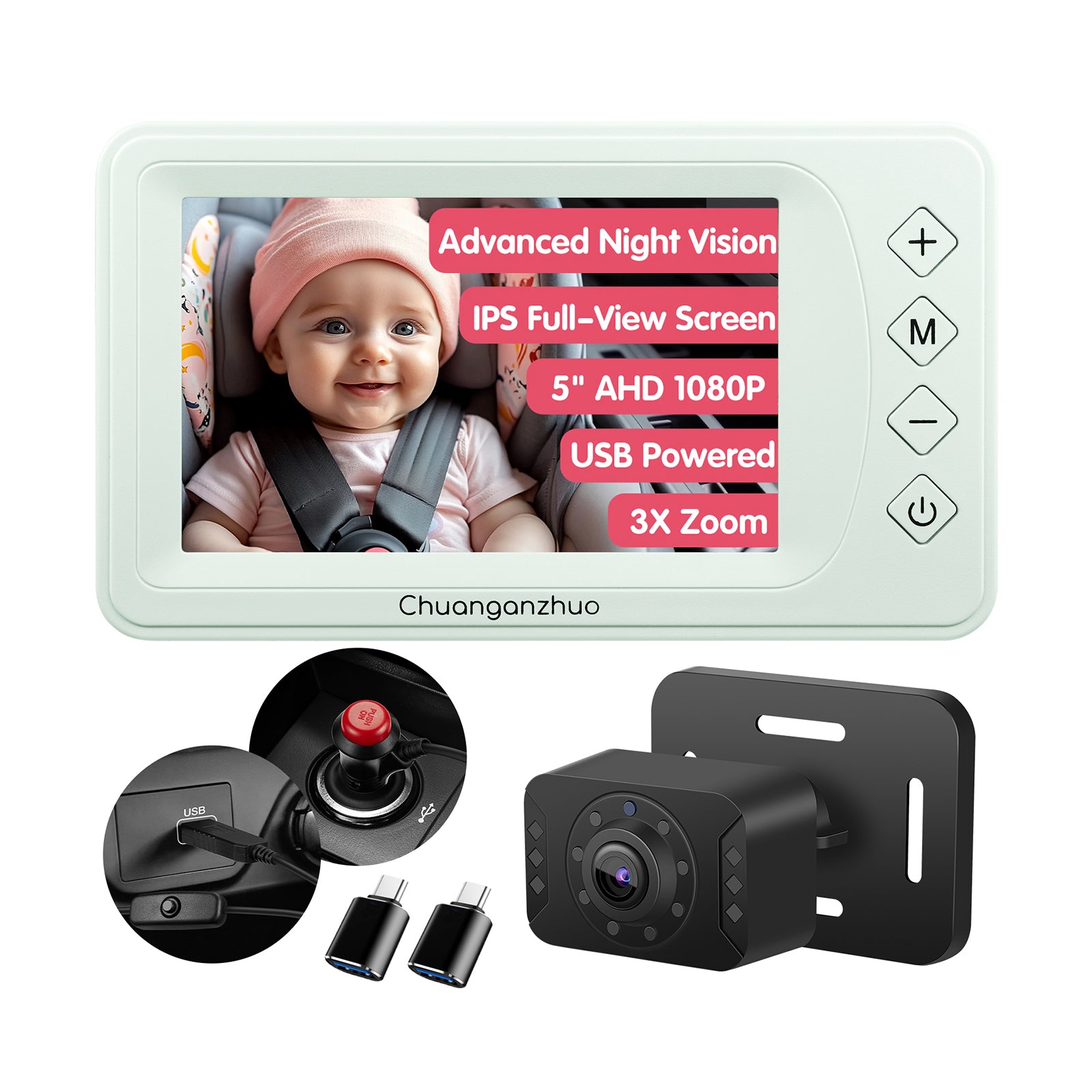 Baby Car Camera with Advanced Crystal-Clear Night Vision, USB C adapter, S100U-Green